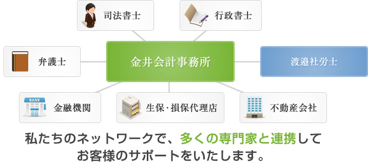 金井会計事務所では、弁護士、司法書士をはじめ他士業の方々とのネットワークが